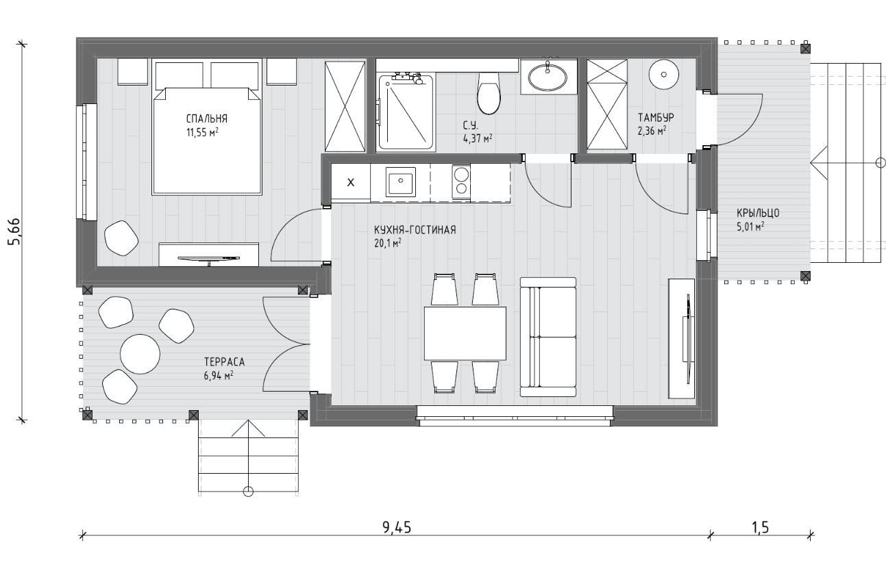 Эффектный одноэтажный угловой дом с террасой под перголой и крыльцом с навесом. Теплая площадь дома очень комфортная и не будет стеснять — 38,38 м². Внутри есть кухня-гостиная с выходом на террасу, санузел, прихожая-тамбур, спальня. Уютная терраса с двух сторон защищена стенами дома. Особенностью проекта является то, что он накрыт односкатной крышей, а выглядит, как дом с плоской кровлей, из-за выравнивающих высоту здания парапетов. На фасаде использованы только вертикальные и горизонтальные линии. Здесь будет удобно холостяку, семейной паре любого возраста и родителям с детьми.Мы тонем в городской суете и ежедневной рутине. Даже тем, кто не представляет себя без городской жизни, иногда нужен отдых и перезагрузка. Ощутить себя заново можно в глэмпингах и парк - отелях, которые открываются в самых живописных местах нашей страны: на берегу моря, в тайге, у реки, в горах, на озерах, в степи. Найдите свое место. Такое, где именно вам будет хорошо и спокойно, где вы выспитесь и отдохнете, и накопившиеся пробле