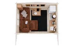 Этот домик, разработан специально для того, чтобы создать дополнительное пространство для жизни. При размере 2,7×3,6 м его площадь составляет 9,9 м² уюта, сопровождаемого ароматом древесины. Дом выполнен из качественных материалов, что обеспечивает его долговечность и надежность