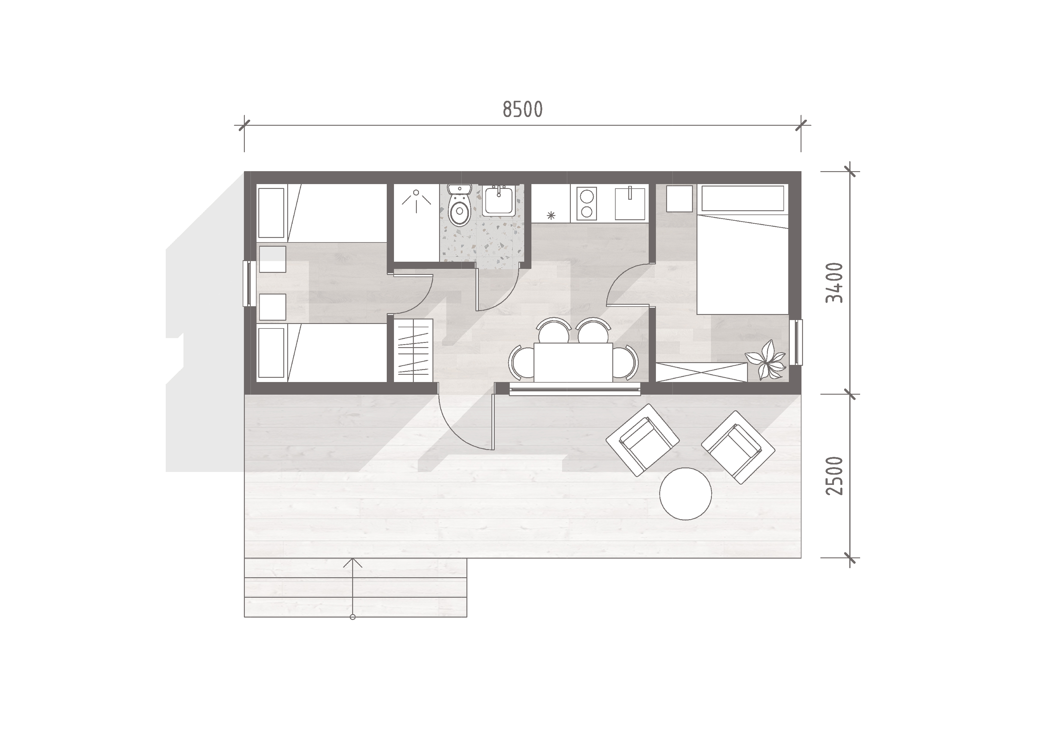 Готовый модульный дом площадью 29 м² (3,4 × 8,5 м) с двумя компактными, но полноценными спальнями и встроенной террасой 21,25 м² — идеален для пары, семьи с ребёнком или двоих друзей, ценящих личное пространство. Подходит для круглогодичного проживания, сдачи в аренду или как основное загородное жильё. Терраса — не опция, а часть комплектации. Уже в цене.