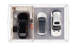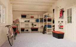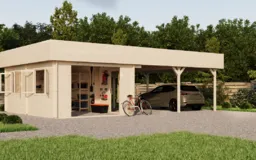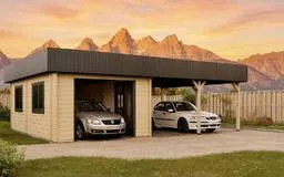 Сборный гараж из мини-бруса 6×9,7 м - рациональное использование пространства площадью 54,7 м². Две функциональные зоны под общей односкатной кровлей создают идеальный тандем: - Закрытый бокс для вашего основного автомобиля, оборудованный двумя окнами для дневного света и отдельной дверью. - Прочный навес, под которым легко разместятся еще два транспортных средства, гостевые машины или квадроцикл. Решение идеально для семьи с несколькими автомобилями, ценящей комфорт и организованность
